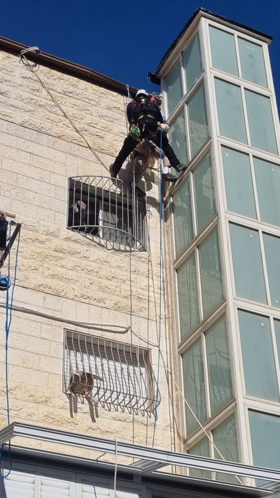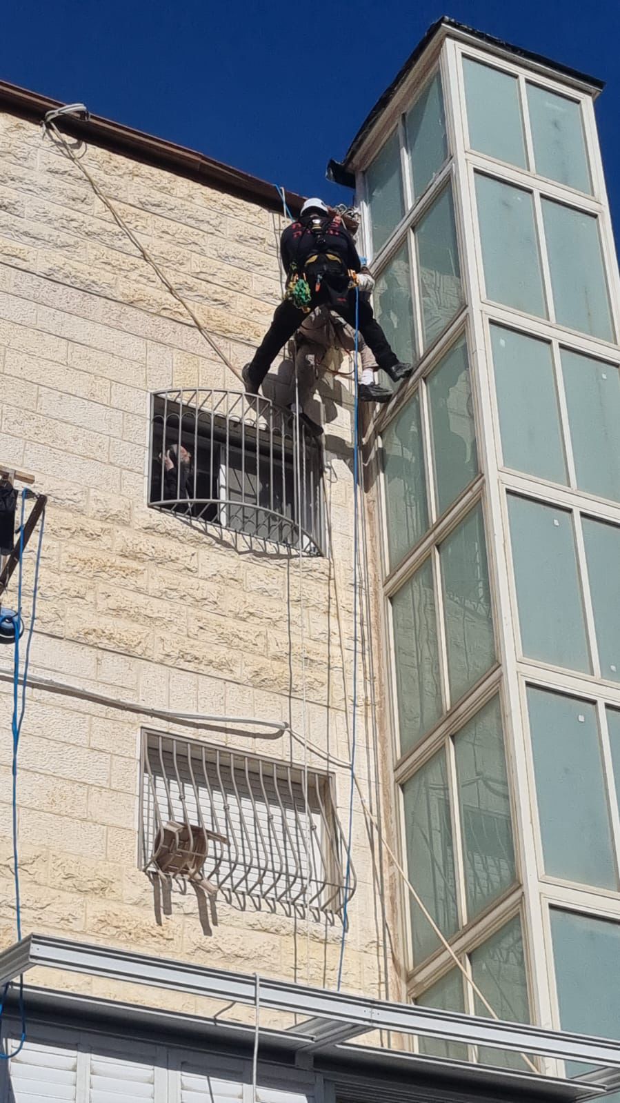 צוותי היחידה לחילוצים מיוחדים של מחוז ירושלים הקימו עמדות גלישה מגג המבנה, גלשו אל האזרח, אבטחו אותו באמצעות רתמות ייעודיות וחילצו אותו בבטחה אל תוך המבנה כשהוא בריא ושלם.