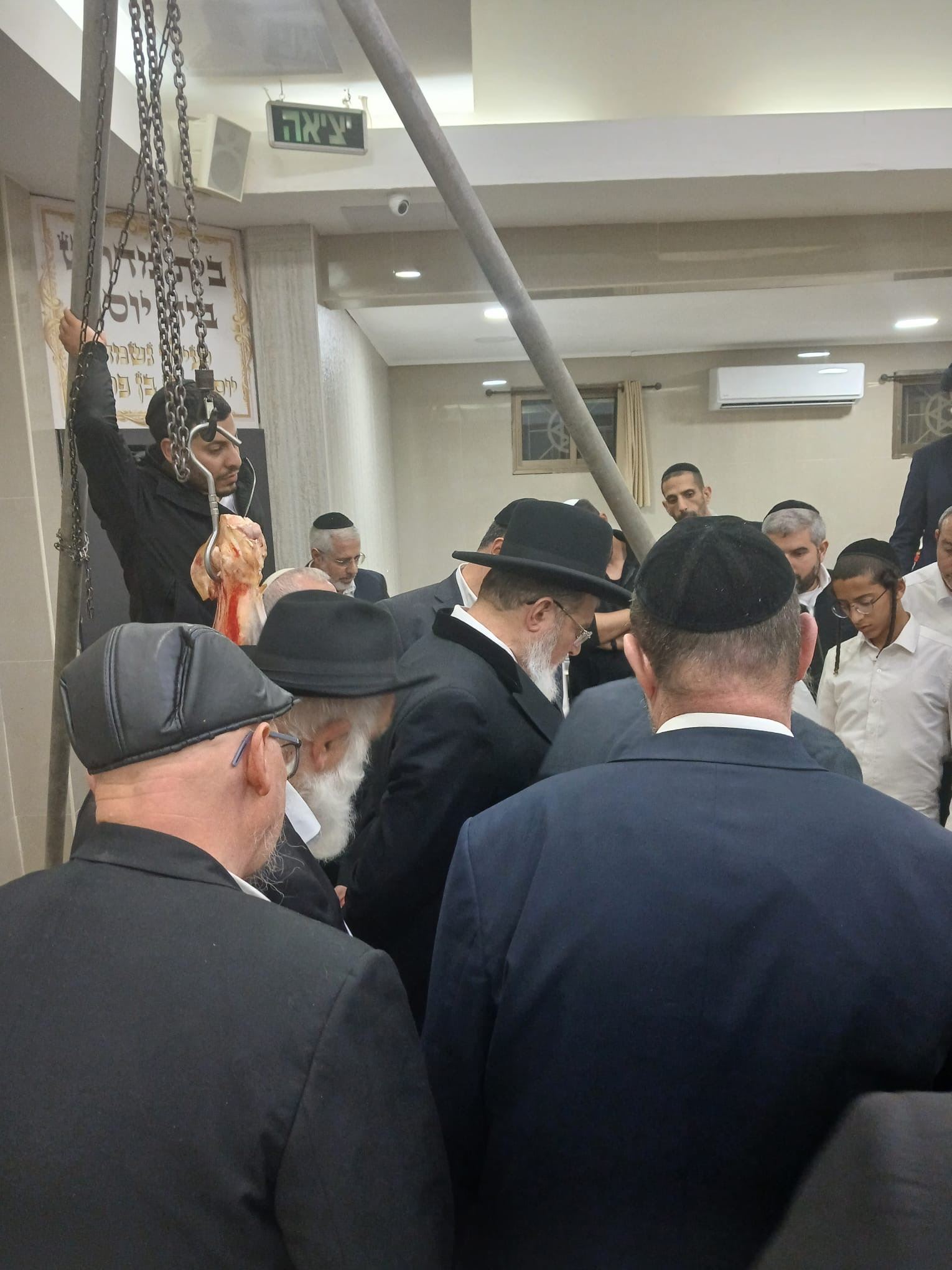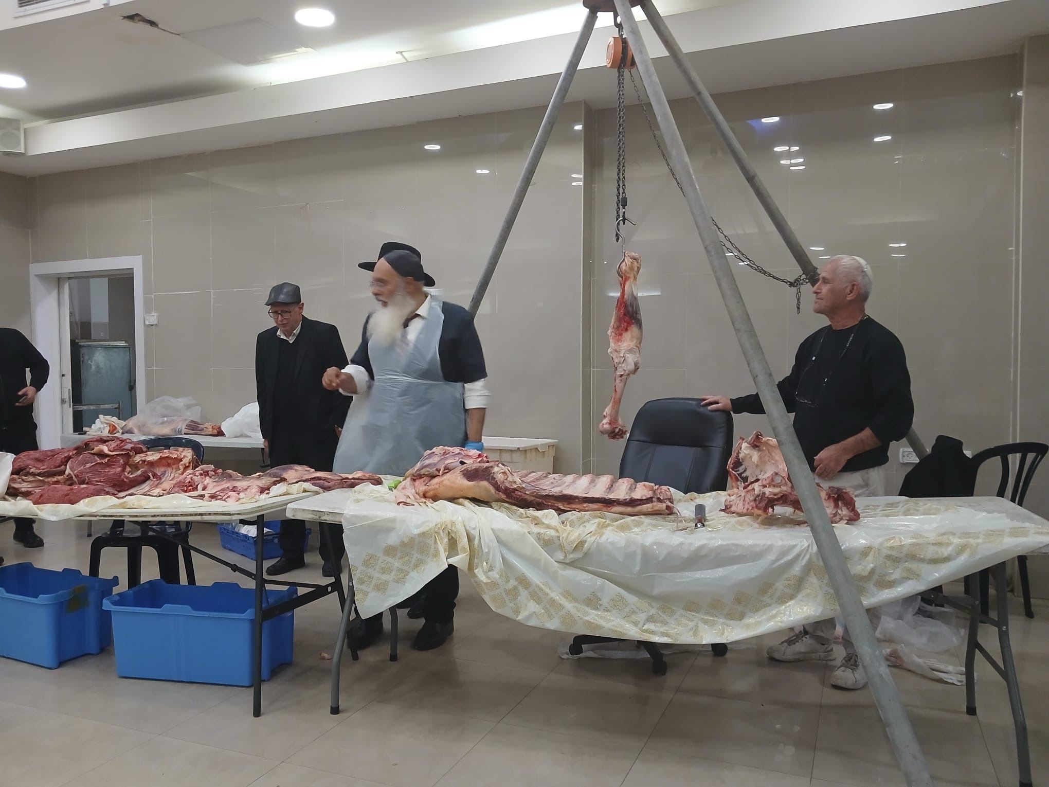 לשם כך אף הובא מנוף קטן, שעליו נתלה חלק אחוריים של הבהמה, אשר בו קיימים חלקים האסורים באכילה מהתורה כמו "חֵלֶב" וגיד הנשה.