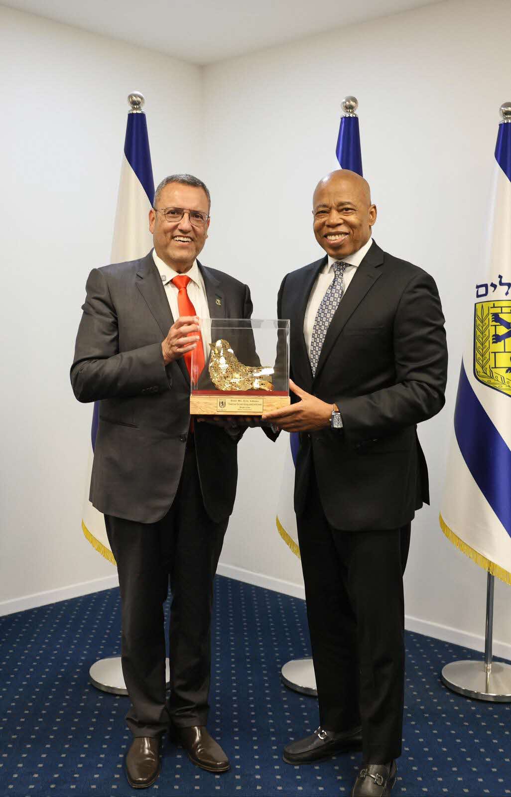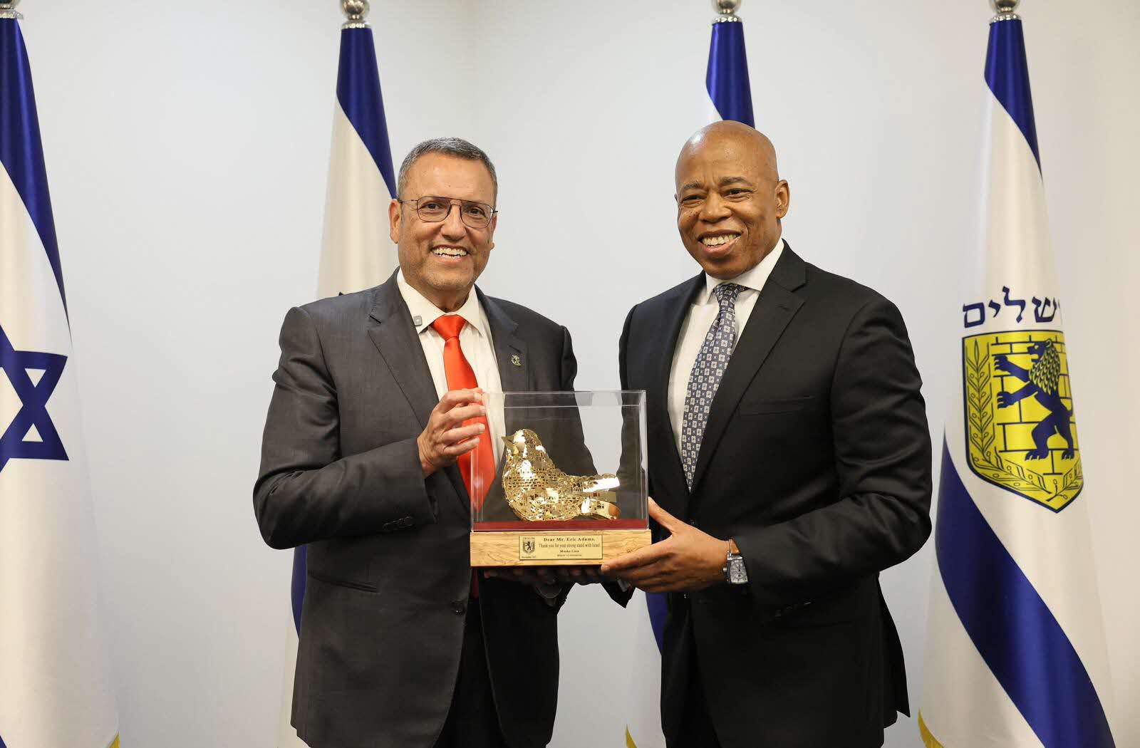 ראש עיריית ניו יורק היוצא, אריק אדמס, שעורך בימים אלו ביקור ממלכתי בישראל ביקר ונפגש עם ראש עיריית ירושלים, מר משה ליאון, בלשכתו שבבניין ספרא.
