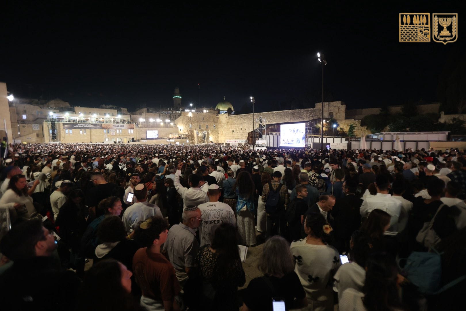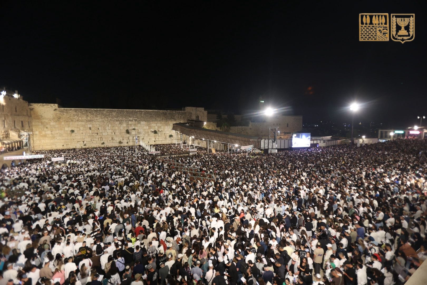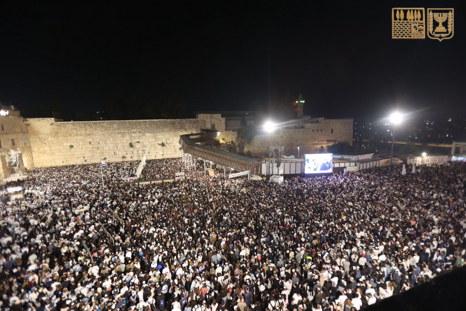 רבבות גדשו את רחבת הכותל וכלל סמטאות העיר העתיקה • האירוע הועבר בשידור חי על מסכי ענק ונפתח בהכנסת ספר תורה • תפילות לשלום החטופים, החיילים והעם כולו