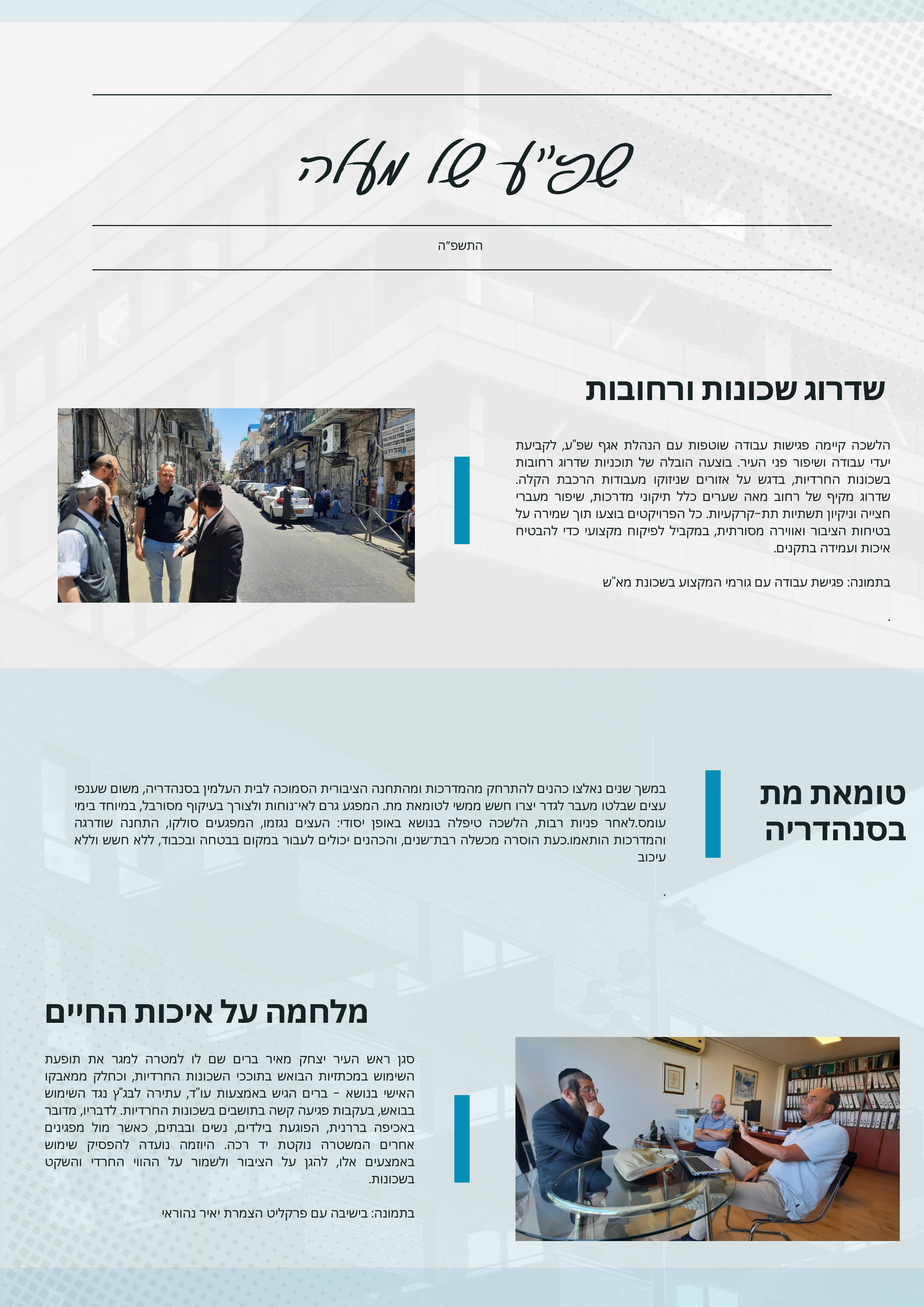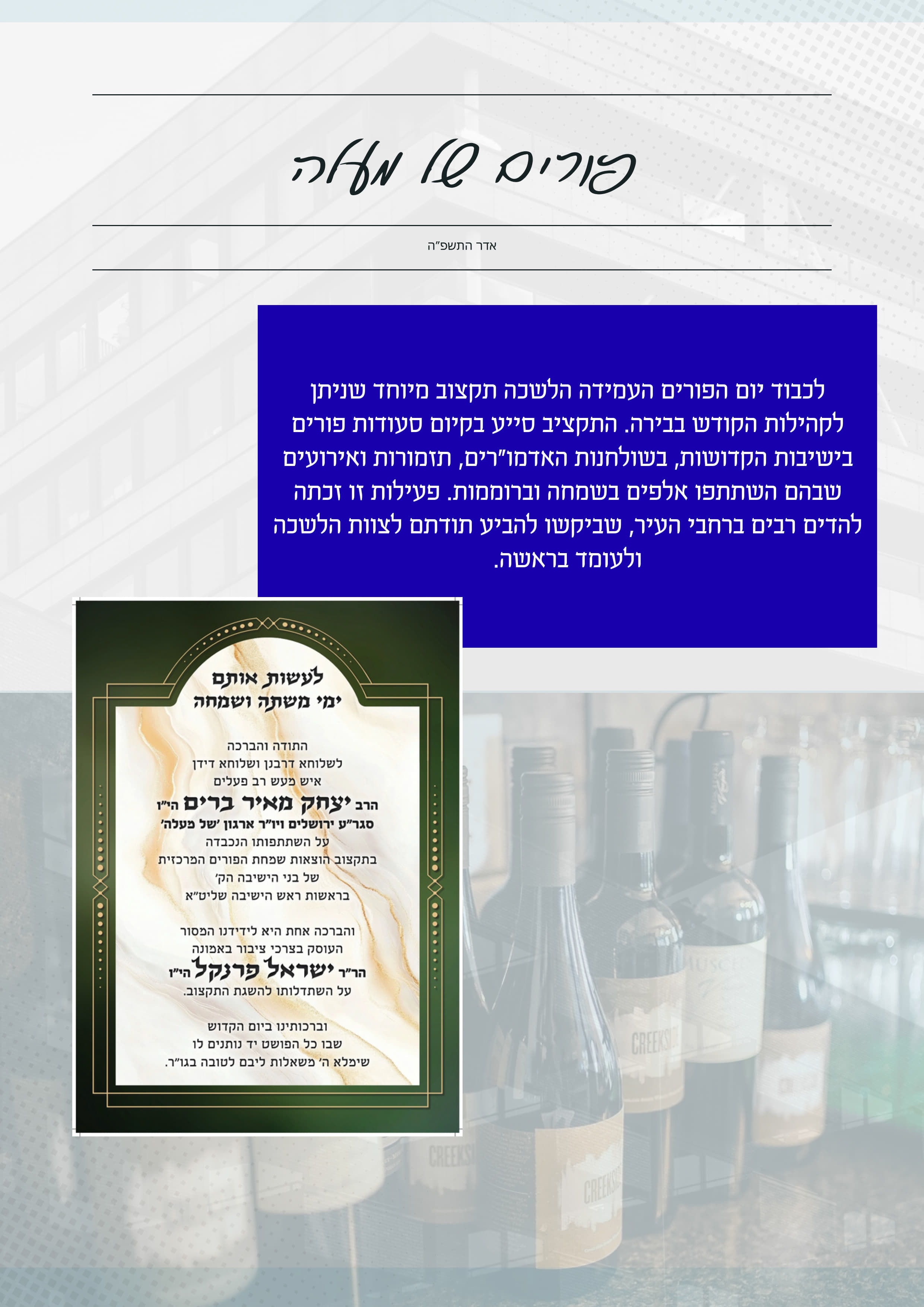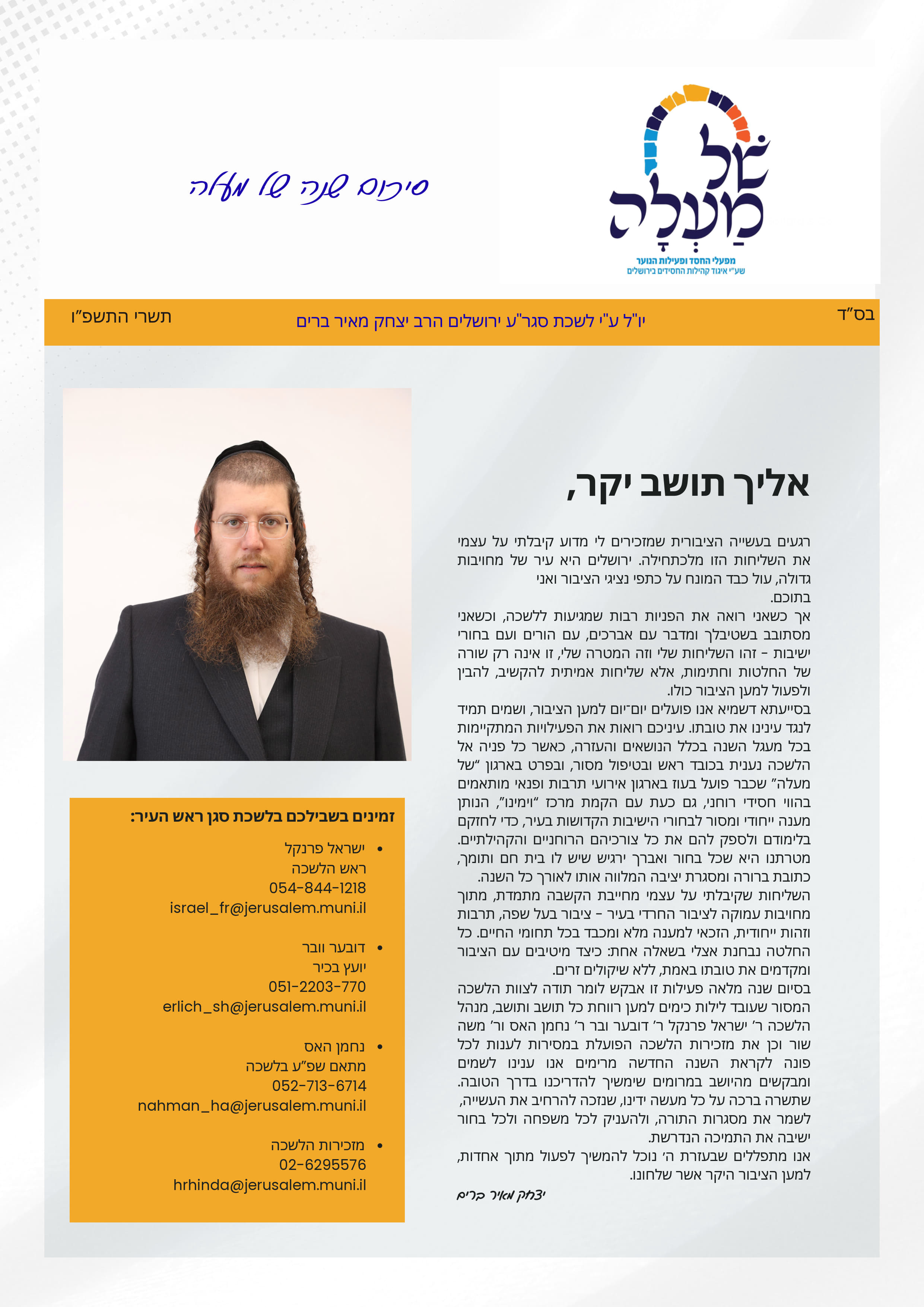 בלשכת סגן ראש העיר יצחק מאיר ברים מפרסמים ניוזלטר חגיגי המסכם את עשיית השנה • מגוון יוזמות חינוכיות, חברתיות ועירוניות למען הציבור החרדי בירושלים • ברים: "השליחות הציבורית היא הקשבה ופעולה למען הכלל"