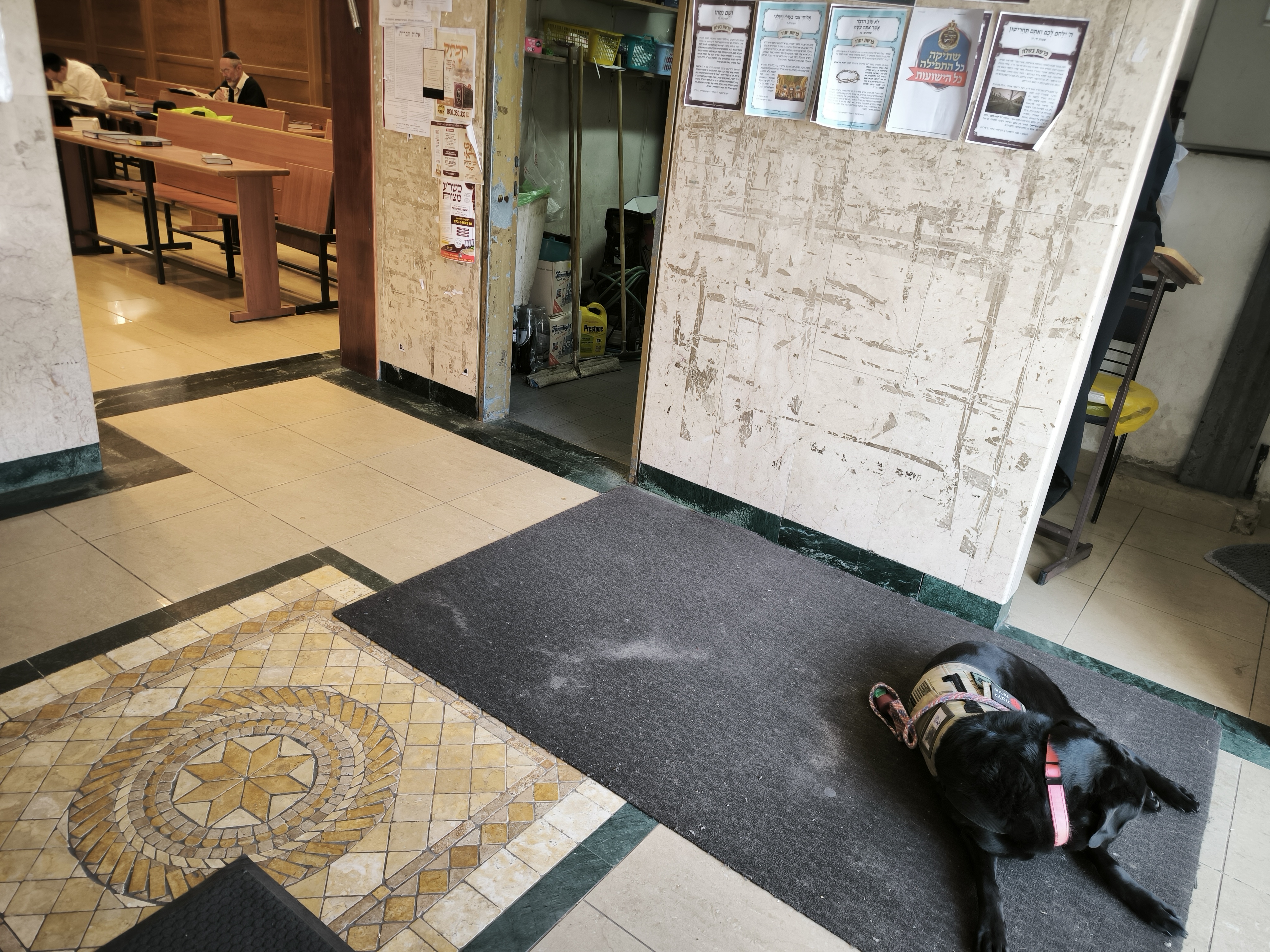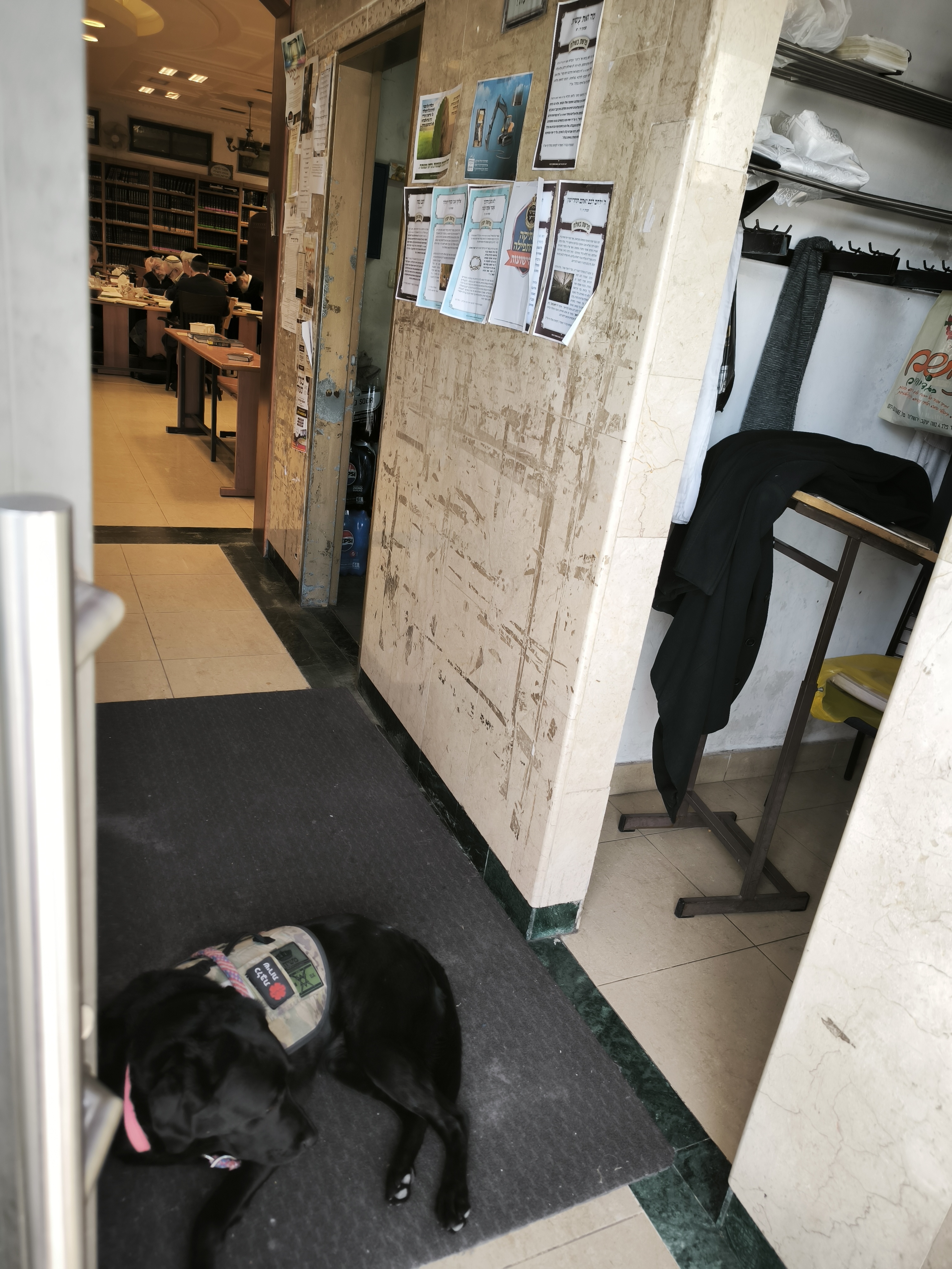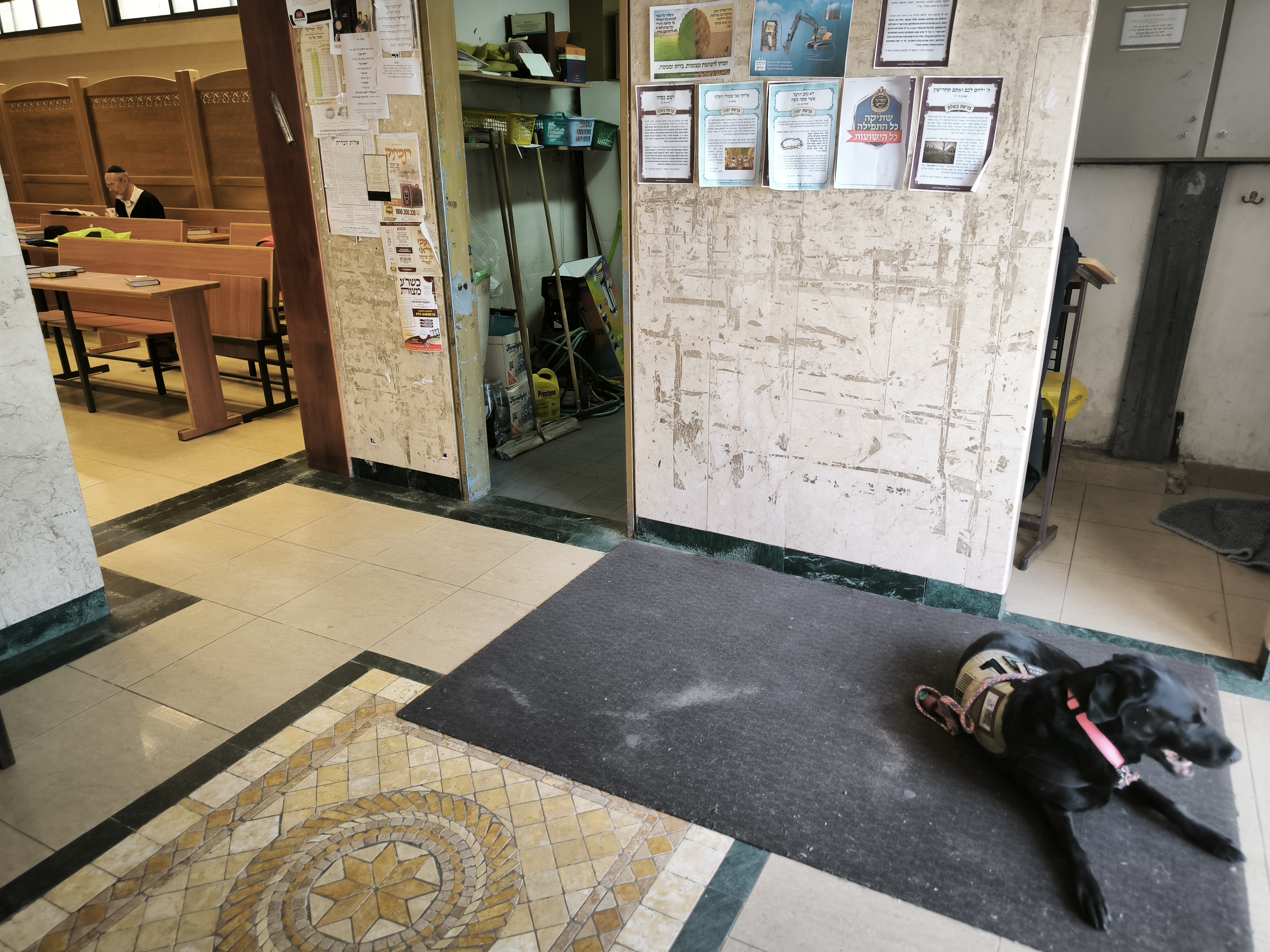 בתוך מבואת הכניסה לבית הכנסת רובץ לאחרונה כלב שחור גדול • זו הסיבה בעטיה התיר הרב את הגעתו לשיעור היומי • בלעדי