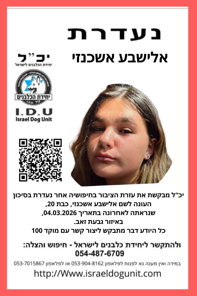 ראיתם אותה? חשש כבד לחייה של צעירה בת 20 הנעדרת מאז אתמול (רביעי), שושן פורים במחוז ירושלים. כוחות גדולים פועלים מאז שעות הבוקר (חמישי) בגבעת זאב ובסביבתה בניסיון לאתרה. הנעדרת, אלישבע אשכנזי, נראתה כאמור לאחרונה אתמול, ומאז נותק עמה הקשר.