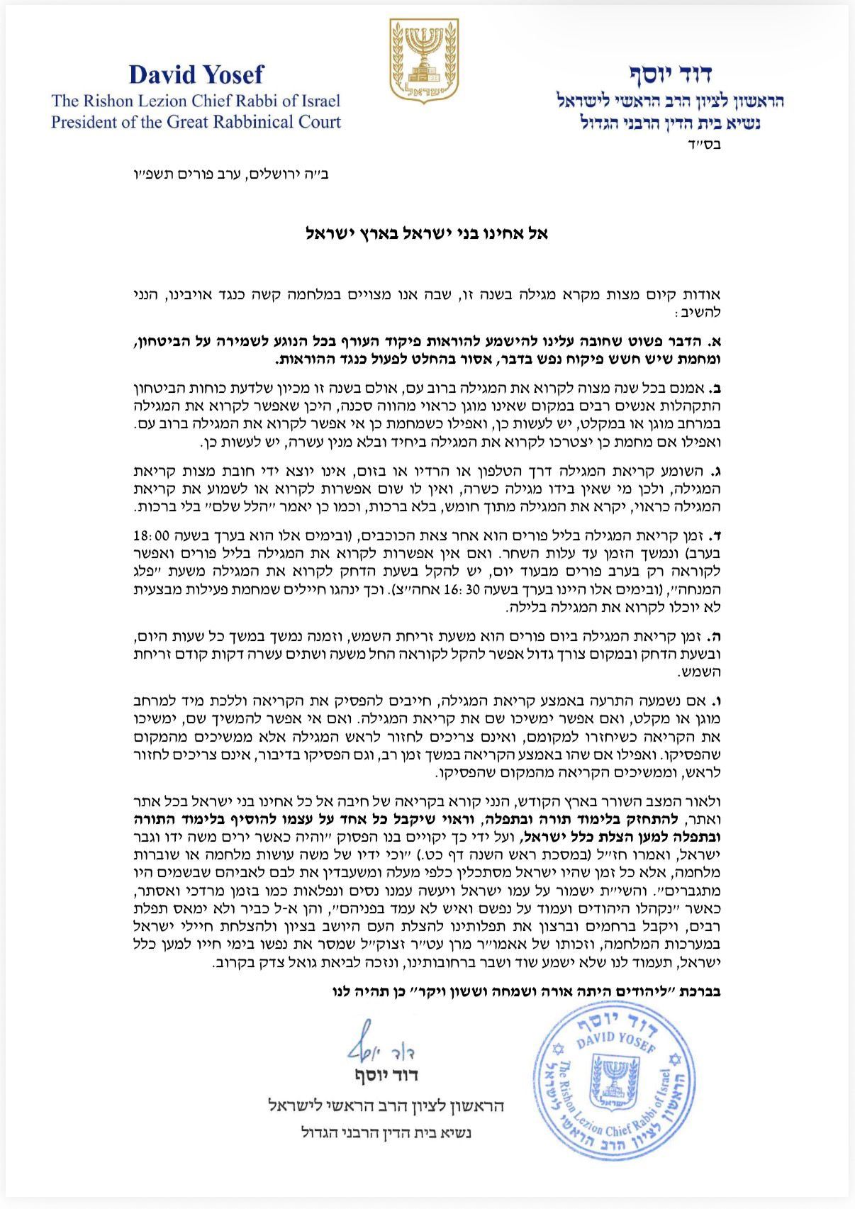 בעקבות המלחמה עם איראן, מרן הראשון לציון הגאון רבי דוד יוסף שליט"א הרב הראשי לישראל כתב מכתב מפורט איך וכיצד לנהוג לקראת ימי הפורים הבעל"ט.