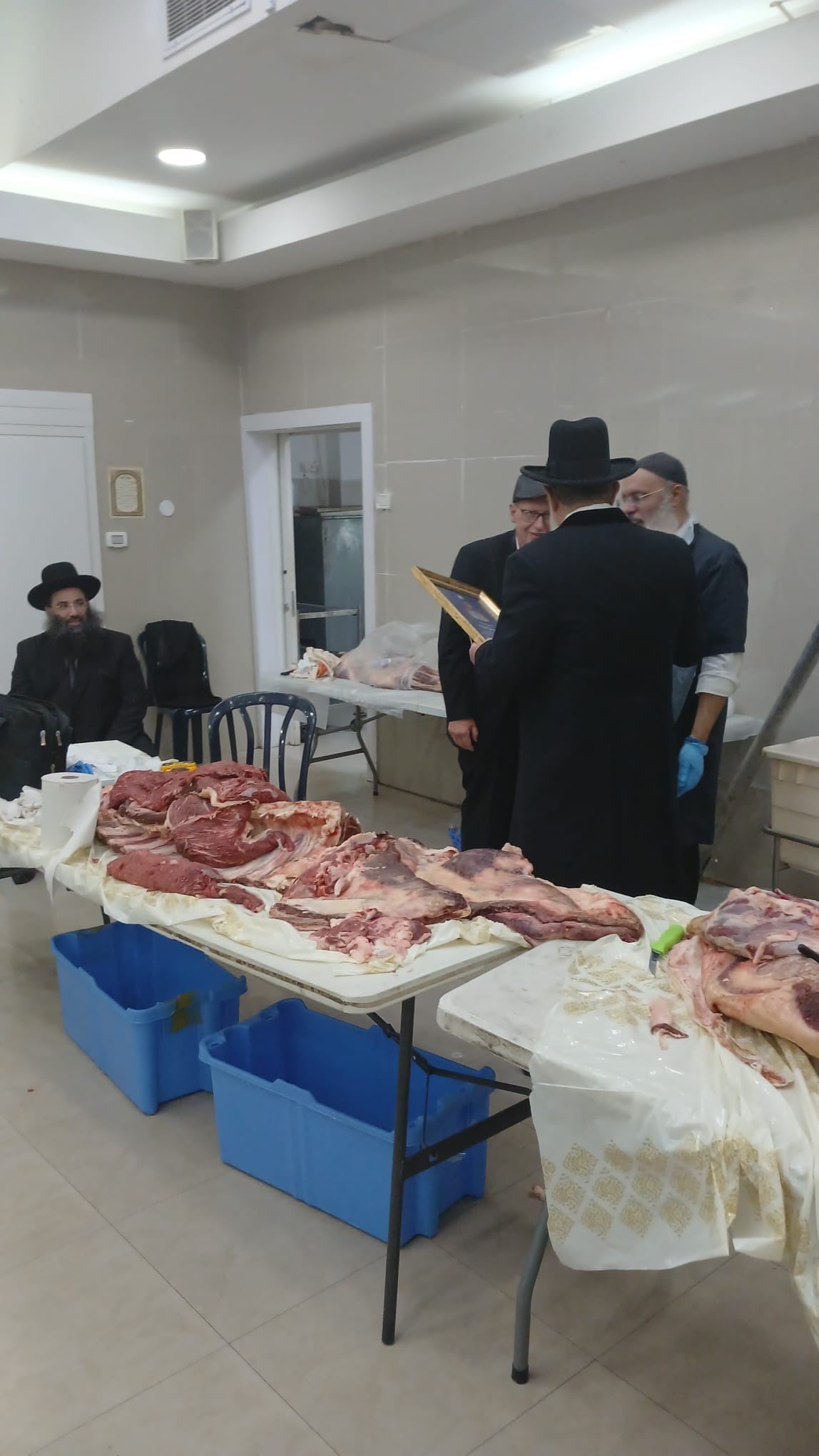 בסיור, באולם שע"י בית הכנסת הוכנו שולחנות מסביב האולם, כשעליהן הונחו חלקי בשר עגל שנשחט ועדיין לפני המלחת הבשר, כשבהן יש חלקים בהם יש חֵלֶב החייבים בניקור.