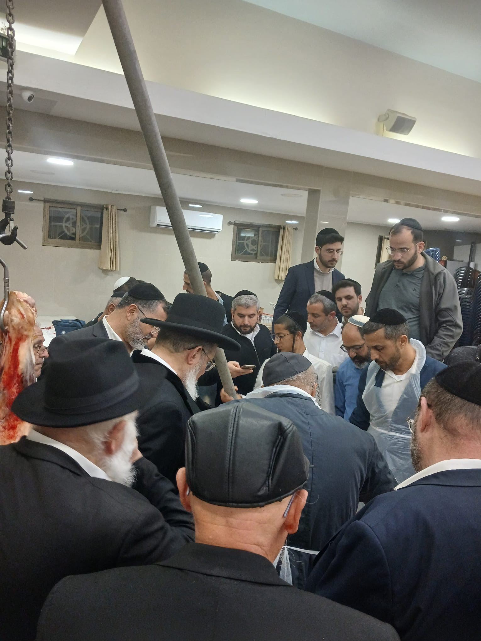 לשם כך אף הובא מנוף קטן, שעליו נתלה חלק אחוריים של הבהמה, אשר בו קיימים חלקים האסורים באכילה מהתורה כמו "חֵלֶב" וגיד הנשה.