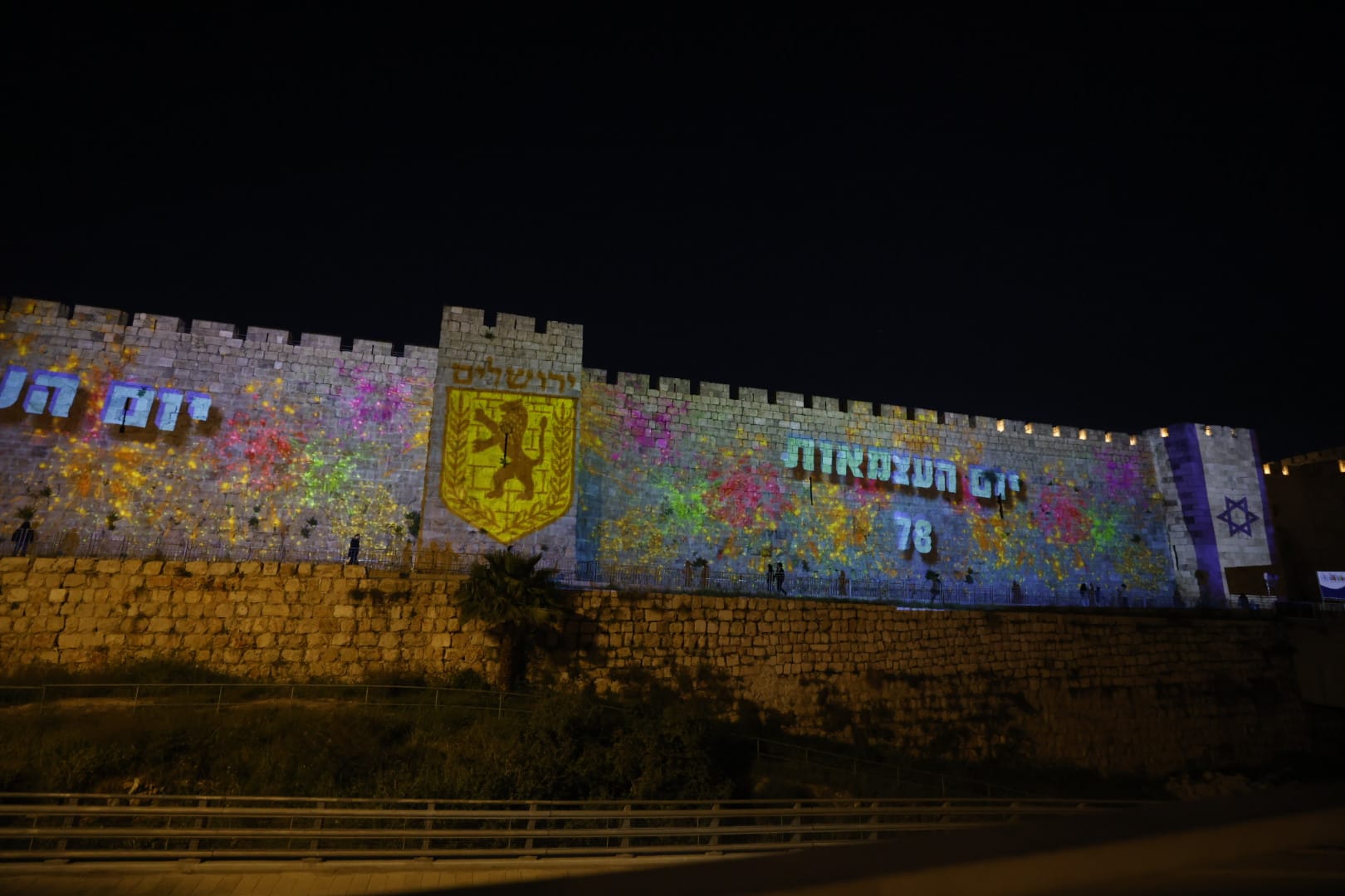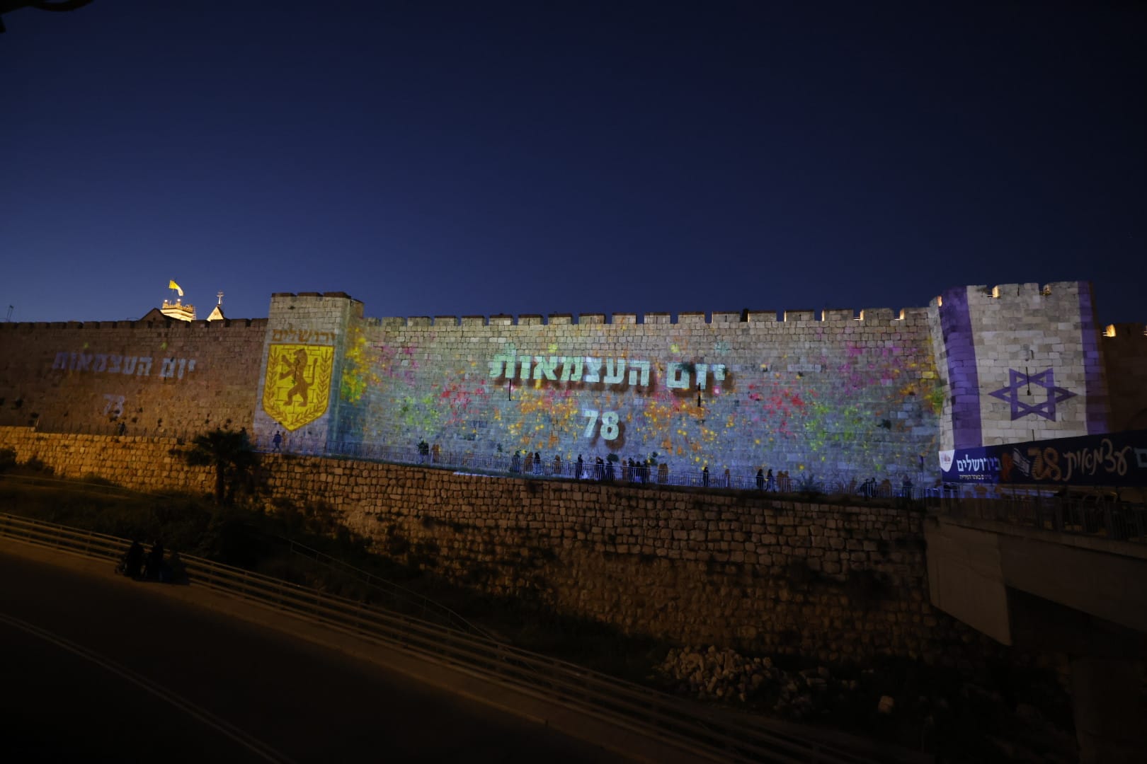 ע'ל ח'ומותייך: חומות העיר העתיקה וגשר המיתרים הוארו הלילה (שלישי) בצבעי הלאום לציון יום העצמאות ה-78 למדינת ישראל. על החומות הוקרנו דגל ישראל ודגל ירושלים לצד זיקוקים והכיתוב "78 שנים למדינת ישראל".