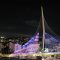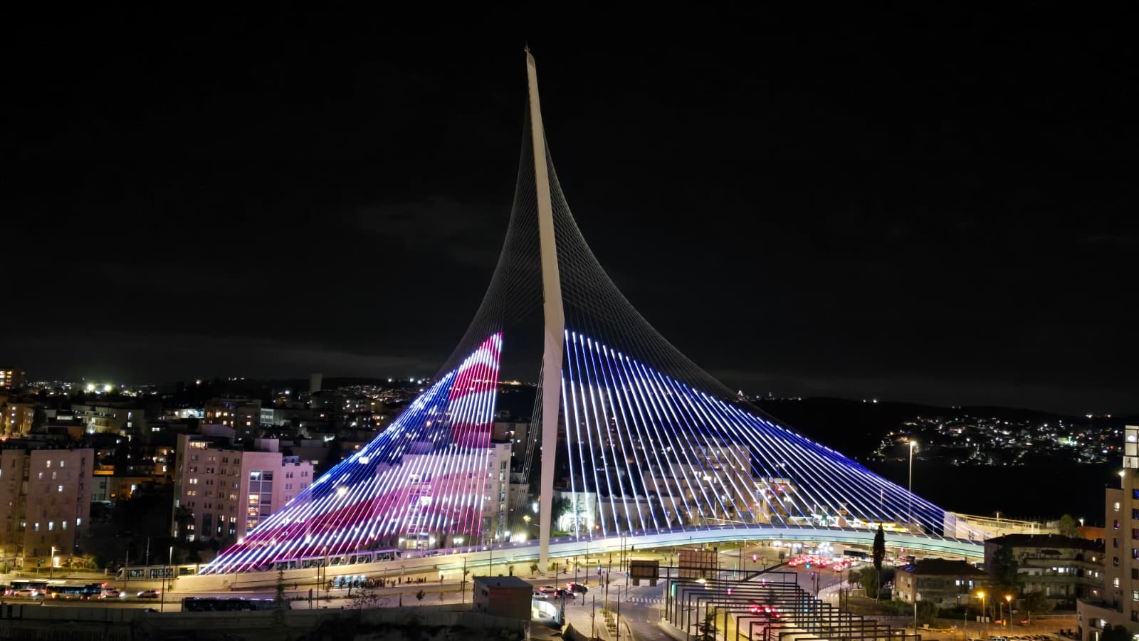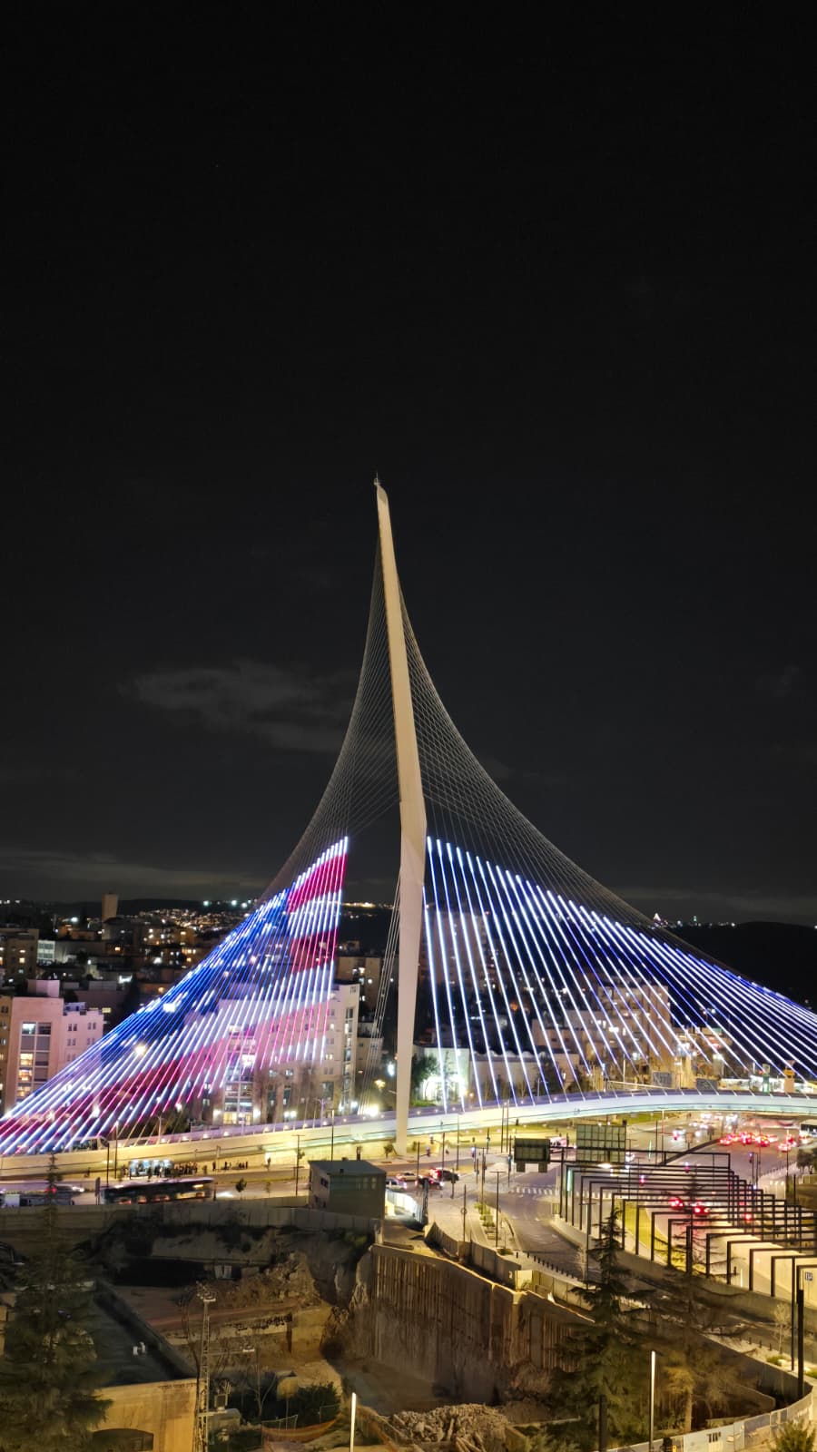 "גשר של תקווה": גשר המיתרים בכניסה לירושלים הואר הערב (ראשון) בצבעי דגלי ישראל וארצות הברית, כמחווה של הוקרה לשותפות בין המדינות ולנשיא ארצות הברית דונלד טראמפ.