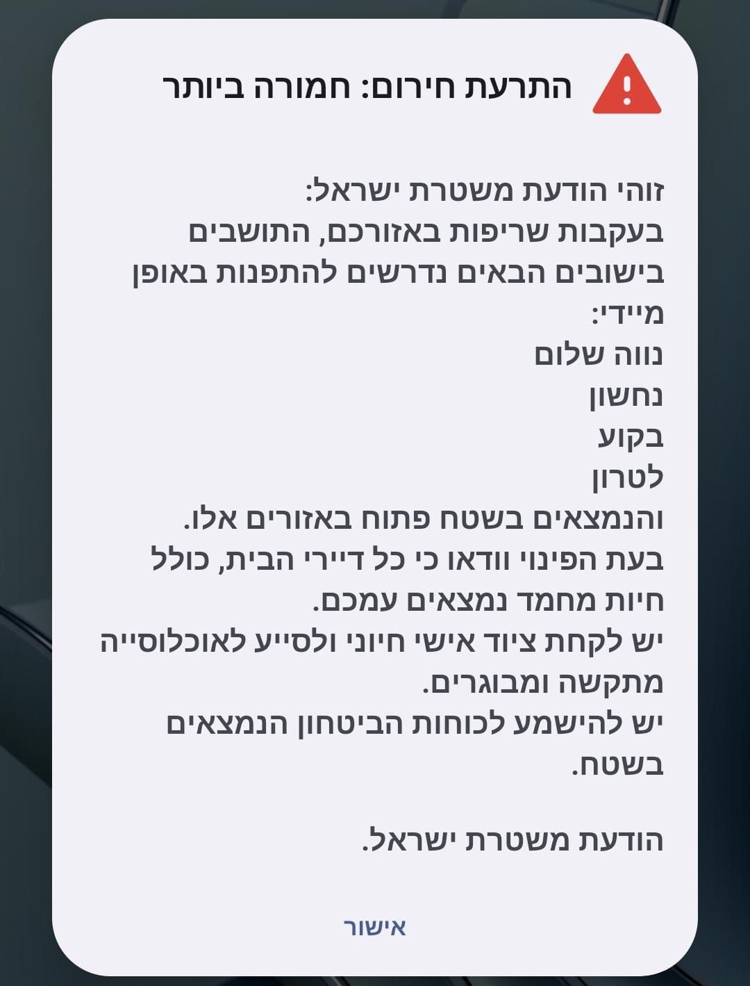 גם המועצה האזורית מטה יהודה פרסמה הודעה דחופה לתושבי מושב תרום: "תושבי מושב תרום מתבקשים להיערך לפינוי - אנו ממליצים להצטייד עם ציוד חיוני ותרופות ולהמתין להנחיות".