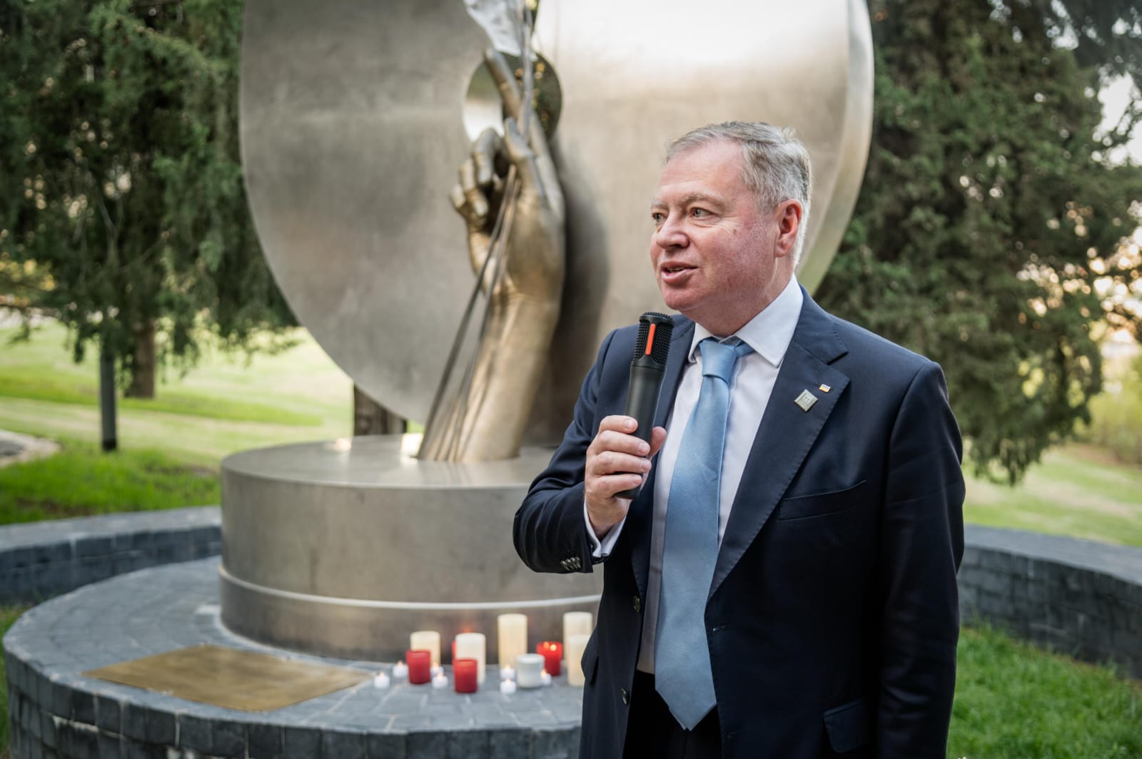 בטקס אמר השגריר קורנייצ'וק: "הולודומור הוא פצע פתוח בהיסטוריה של אומתנו. כאן, בלב ירושלים, אנו מנציחים את המיליונים שנרצחו ברעב מכוון. זוהי תזכורת לכך שהמאבק למען האמת, הצדק והחופש הוא מאבק מתמשך ואסור לנו לשכוח אותו לעולם. למרבה הצער, גם היום אנו עדים לרוסיה שממשיכה להפעיל אכזריות כלפי העם האוקראיני, אך רוחנו נותרה בלתי שבורה, ונמשיך להגן על חירותנו". צילום: שגרירות אוקראינה
