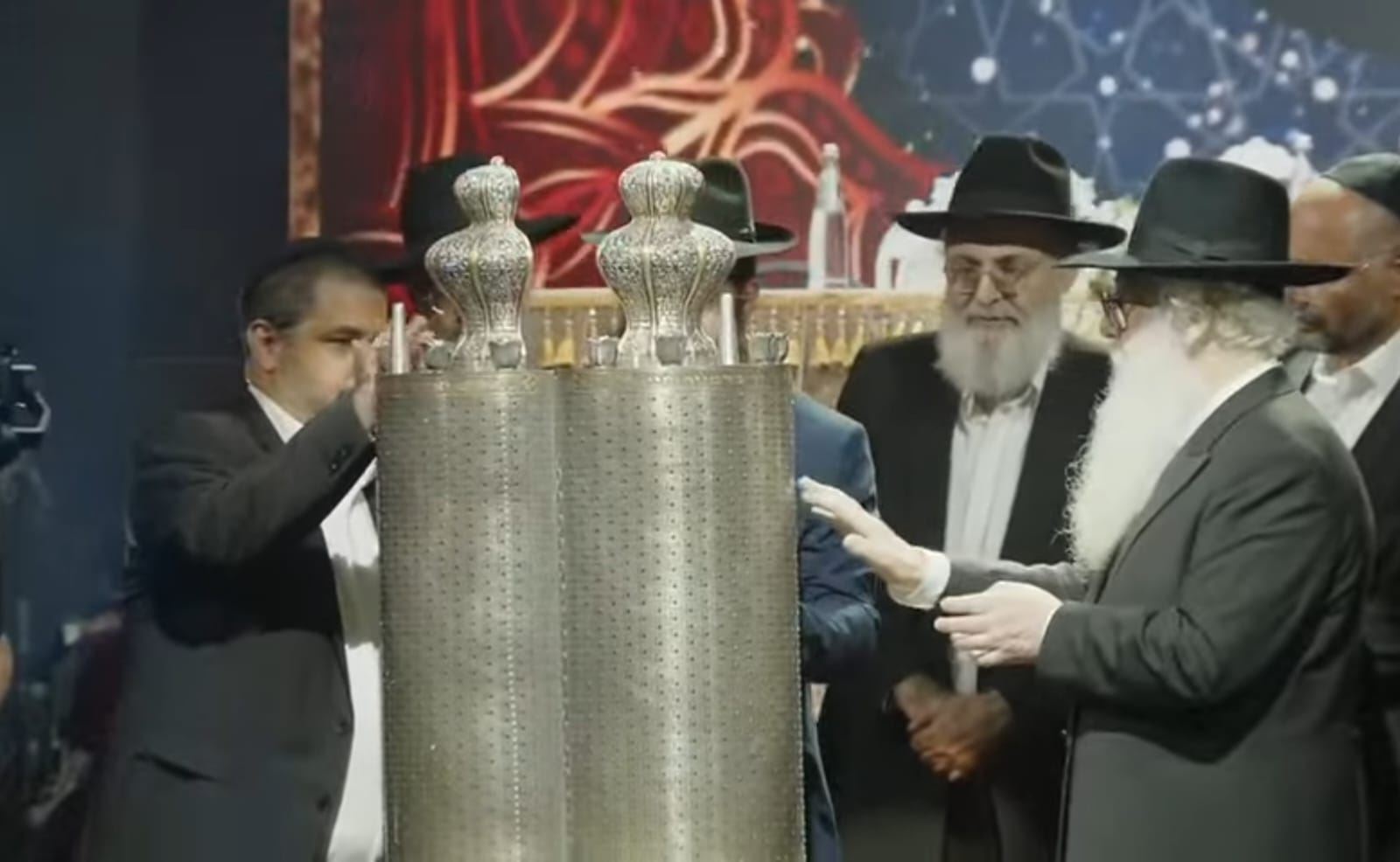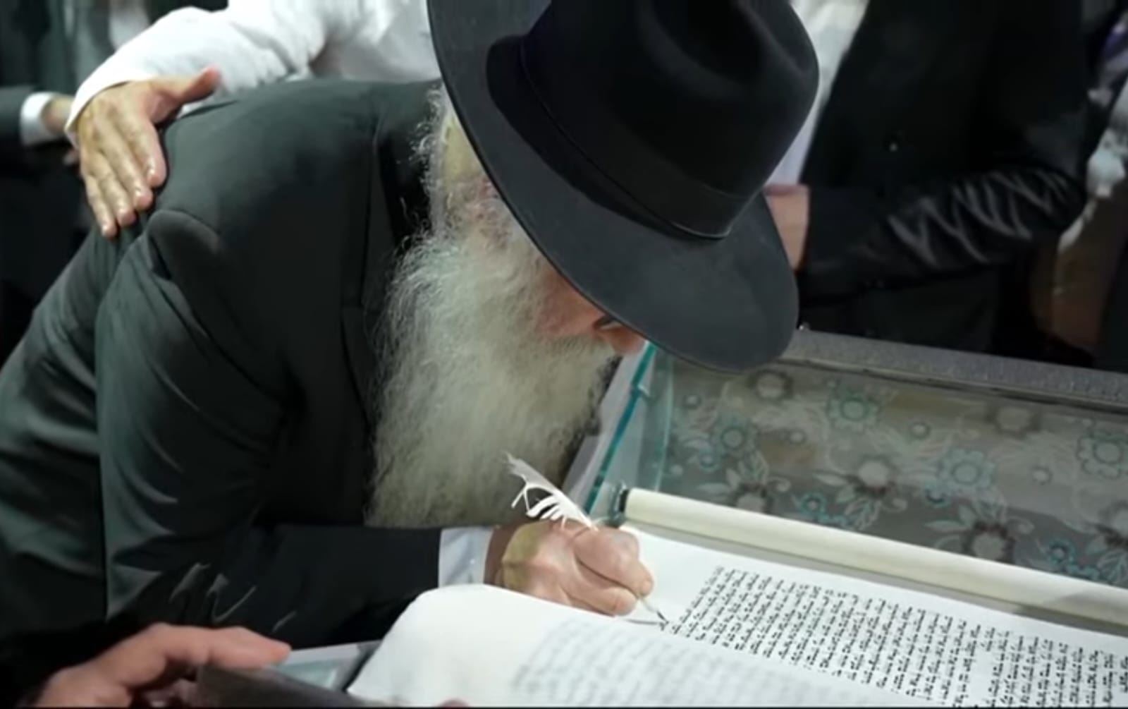 את המילה האחרונה בספר התורה כובד הגר"ד פינטו כשלאחר מכן ערכו הגבהה לספר התורה לעין כל אלפי המשתתפים.