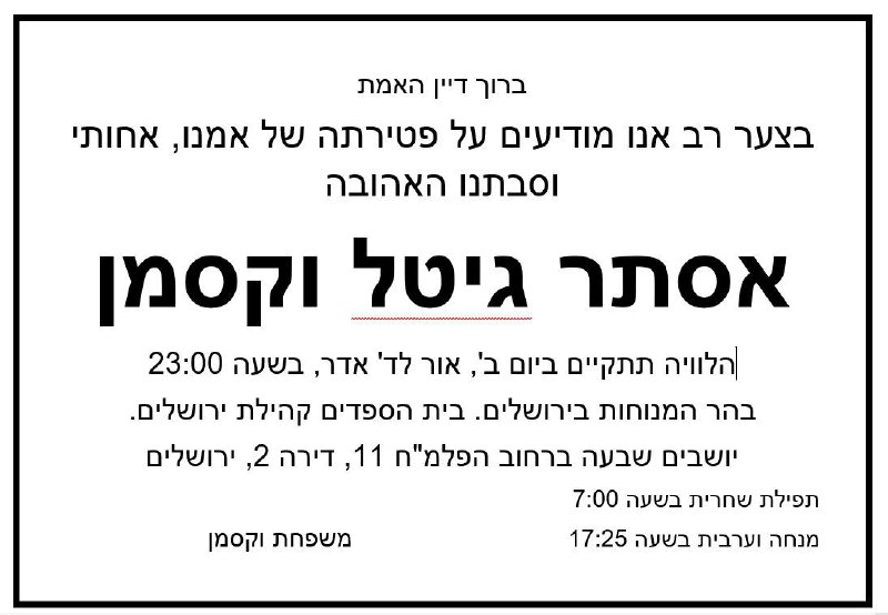 "וַתּוֹסֶף אֶסְתֵּר": אמו של החייל החטוף נחשון וקסמן הי"ד, הלכה לעולמה בירושלים